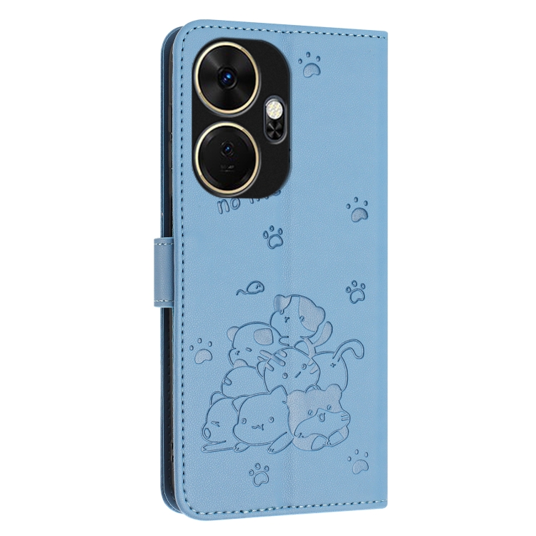 Funda de Cuero Itel P55+ con Diseño de Gatito en Relieve y Cordón (Azul)