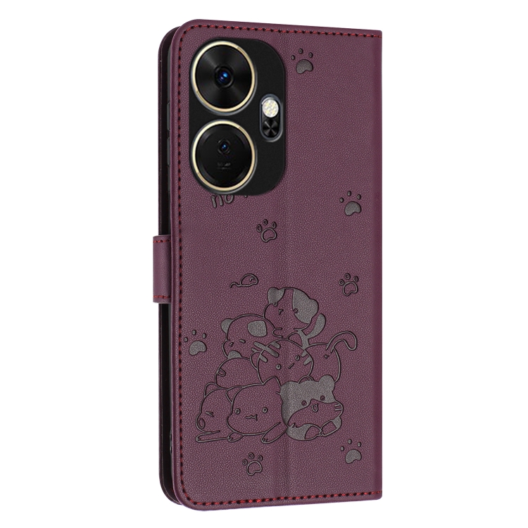 Funda de Cuero Itel P55+ con Diseño de Gatito en Relieve y Cordón (Rojo Vino)