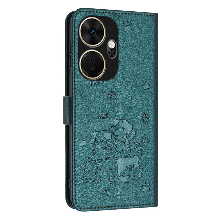 Funda de Cuero Itel P55+ con Diseño de Gatito en Relieve y Cordón (Verde Oscuro)
