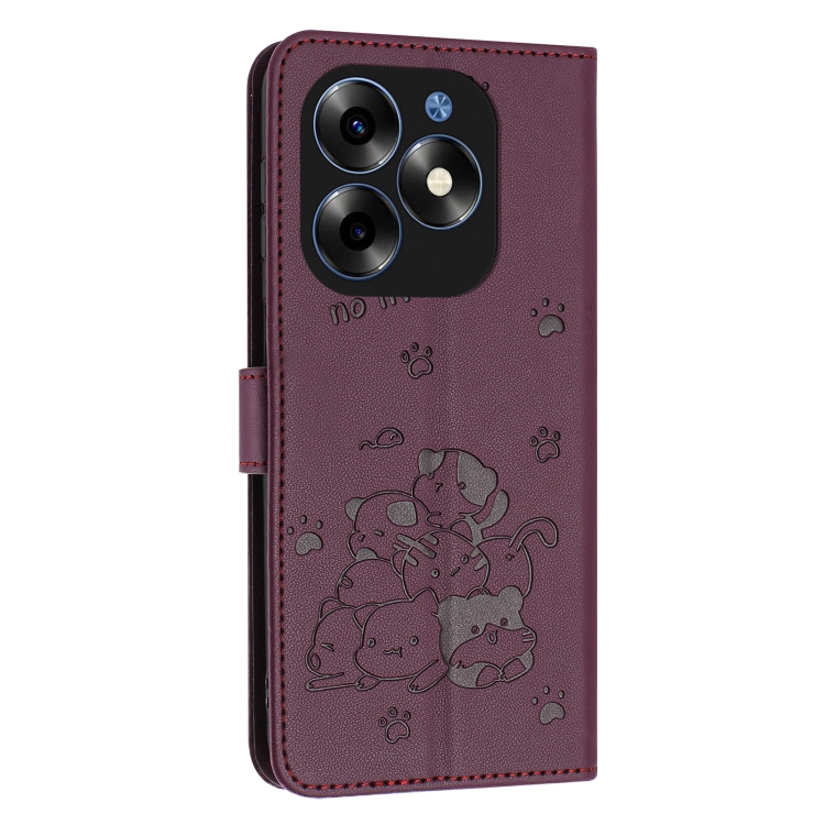 Funda de Cuero Itel S23+ con Diseño de Gatito en Relieve y Cordón (Rojo Vino)