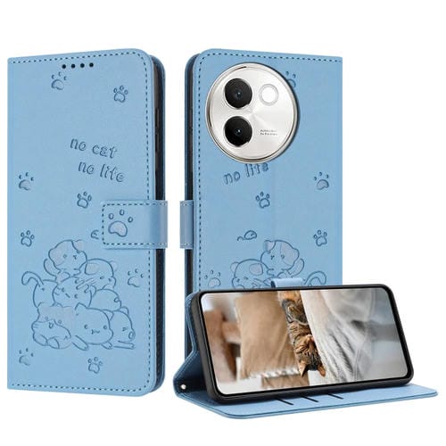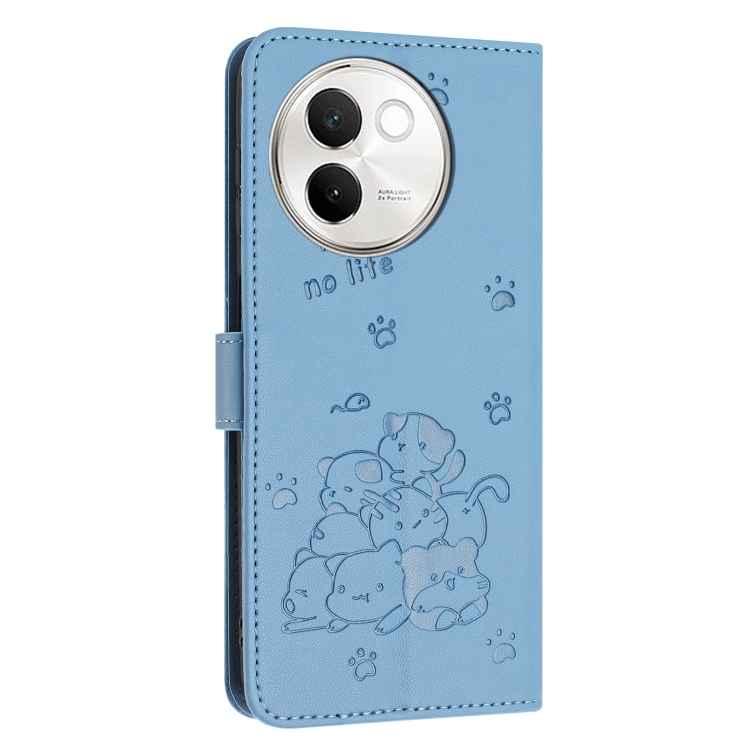 Funda de Piel con Diseño de Gatito En Relieve y Cordón para Vivo V30E 5G / V40 Lite 5G (Azul)