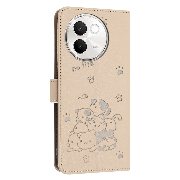 Funda de Piel con Diseño de Gatito En Relieve y Cordón para Vivo V30E 5G / V40 Lite 5G (Beige)