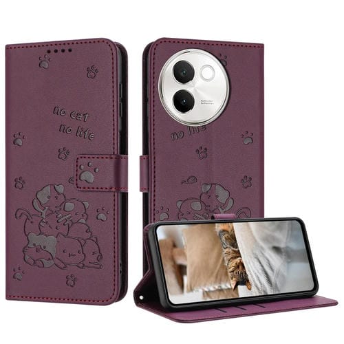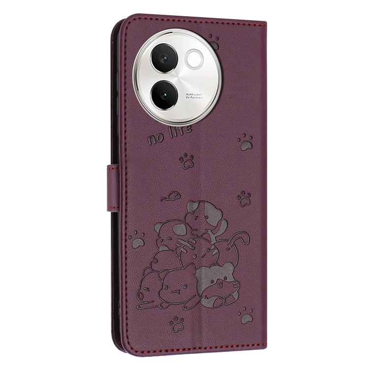 Funda de Piel con Diseño de Gatito En Relieve y Cordón para Vivo V30E 5G / V40 Lite 5G (Rojo Vino)