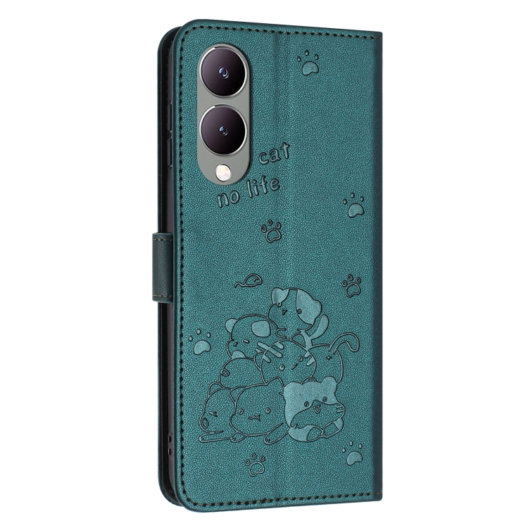 Funda de Piel con Diseño de Gatito En Relieve y Cordón para Vivo Y17S Global / Y36I 5G (Verde Oscuro)