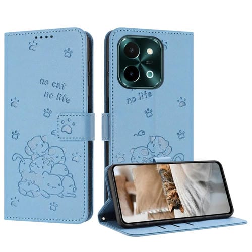 Funda de Piel con Diseño de Gatito En Relieve y Cordón para Vivo Y28 4G / Iqoo Z9X 5G (Azul)