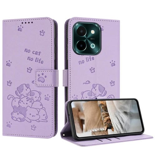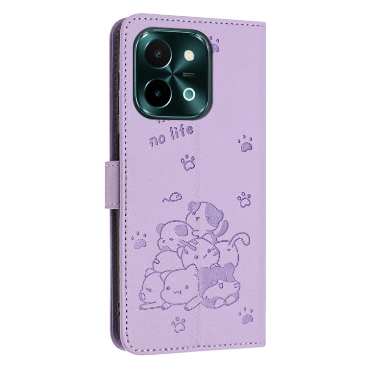 Funda de Piel con Diseño de Gatito En Relieve y Cordón para Vivo Y28 4G / Iqoo Z9X 5G (Morado)