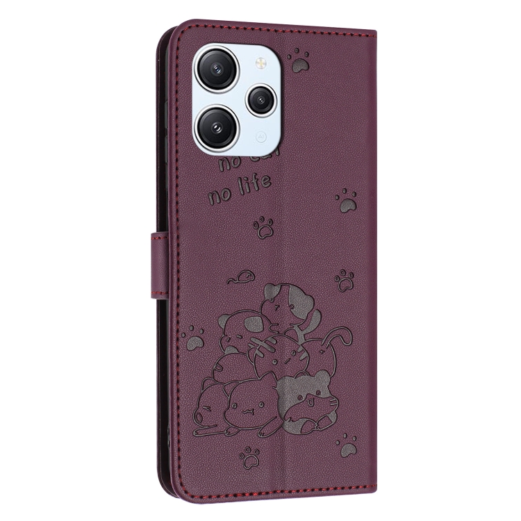 Funda de Piel con Diseño de Gatito En Relieve y Cordón para Xiaomi Poco M6 Pro 5G (Rojo Vino)