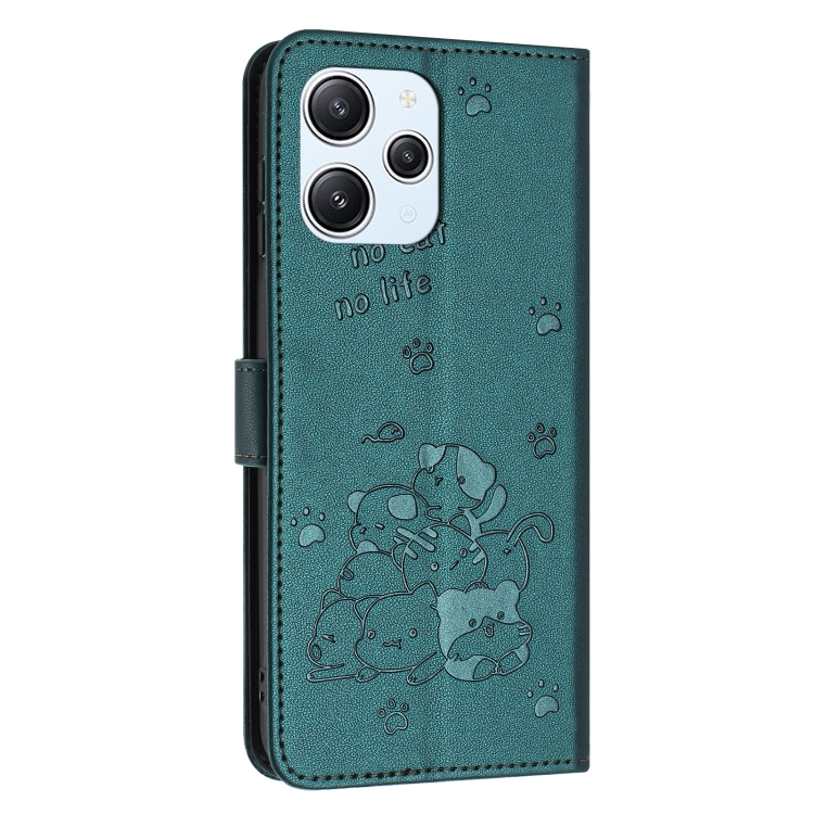 Funda de Piel con Diseño de Gatito En Relieve para Xiaomi Poco M6 Pro 5G con Cordón (Verde Oscuro)