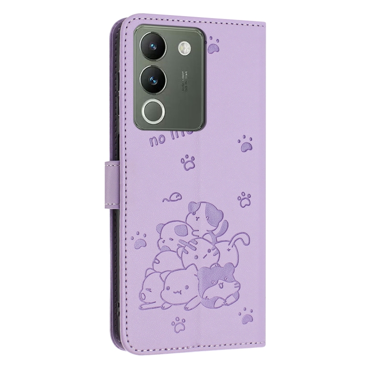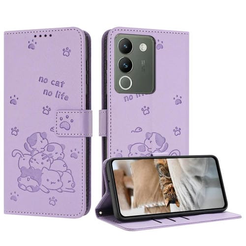 Funda de Cuero con Diseño de Gatito En Relieve para Vivo Y200 5G (Morado)