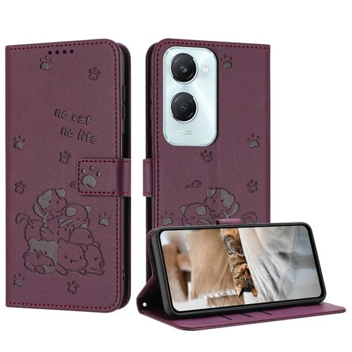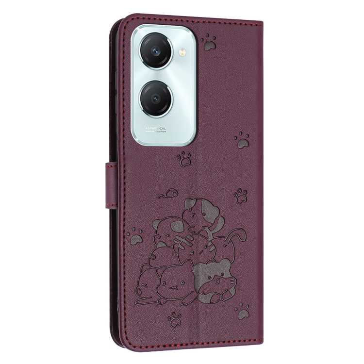Funda de Piel con Diseño de Gatito En Relieve y Cordón para Vivo Y03 4G / Y18 / Y18E (Rojo Vino)