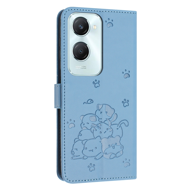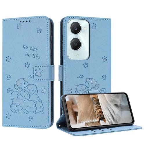 Funda de Piel con Diseño de Gatito En Relieve y Cordón para Vivo Y03 4G / Y18 / Y18E (Azul)