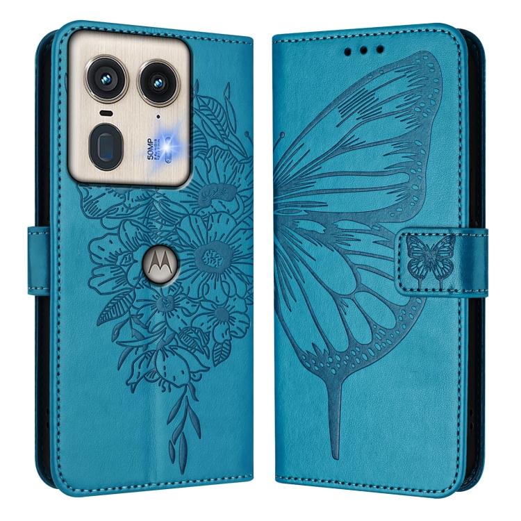 Funda de Cuero Motorola Edge 50 5G con Diseño de Mariposa en Relieve (Azul)