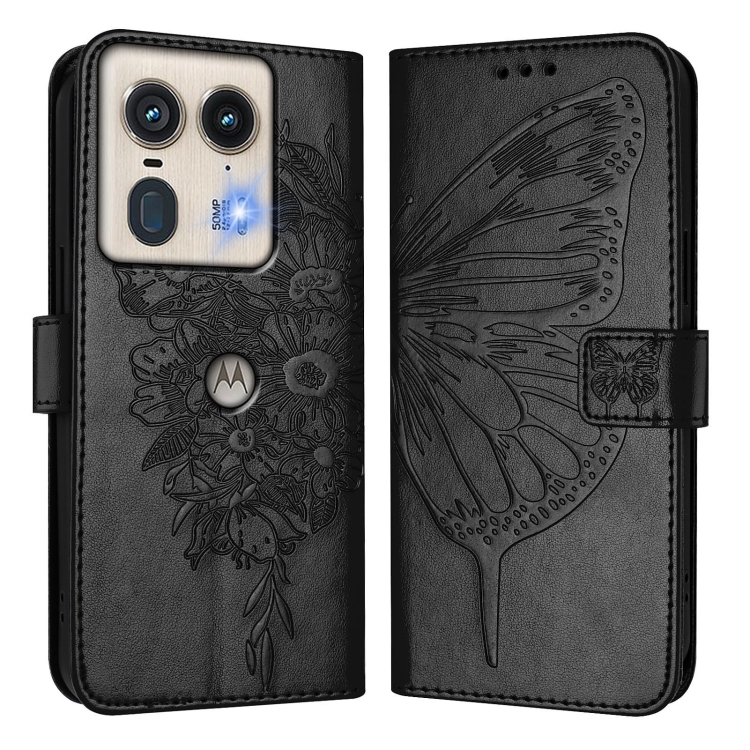 Funda de Cuero Motorola Edge 50 5G con Diseño Mariposa en Relieve (Negra)