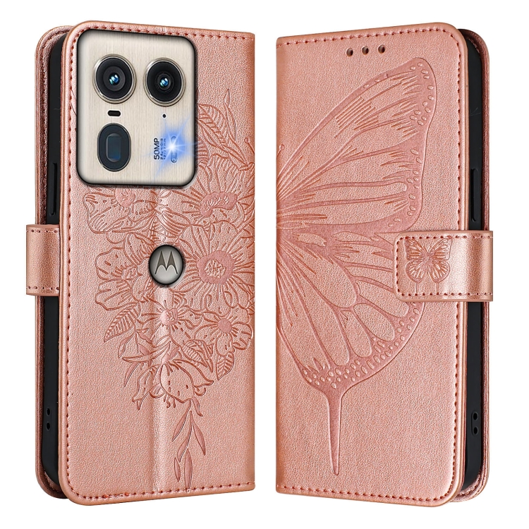 Funda de Cuero Motorola Edge 50 5G con Diseño de Mariposa en Relieve (Oro Rosa)