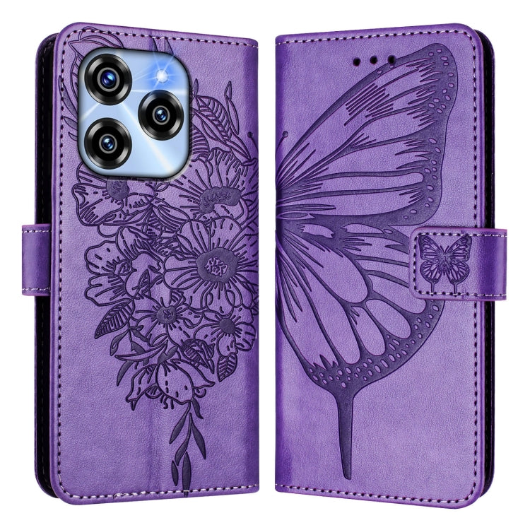 Funda de Cuero para Oukitel C50 con Diseño de Mariposa en Relieve (Morado)