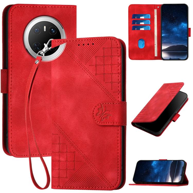 Funda de Cuero Huawei Mate 70 con Diseño Mariposa En Relieve y Cordón (Rojo)