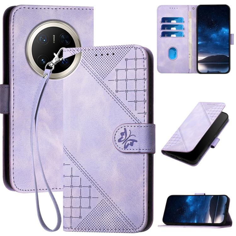 Funda de Cuero Huawei Mate 70 Pro y Mate 70 Pro+ con Mariposa en Relieve y Cordón (Morado Claro)