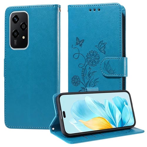 Funda de Cuero Honor 200 Lite con Diseño de Mariposas y Flores en Relieve (Azul)