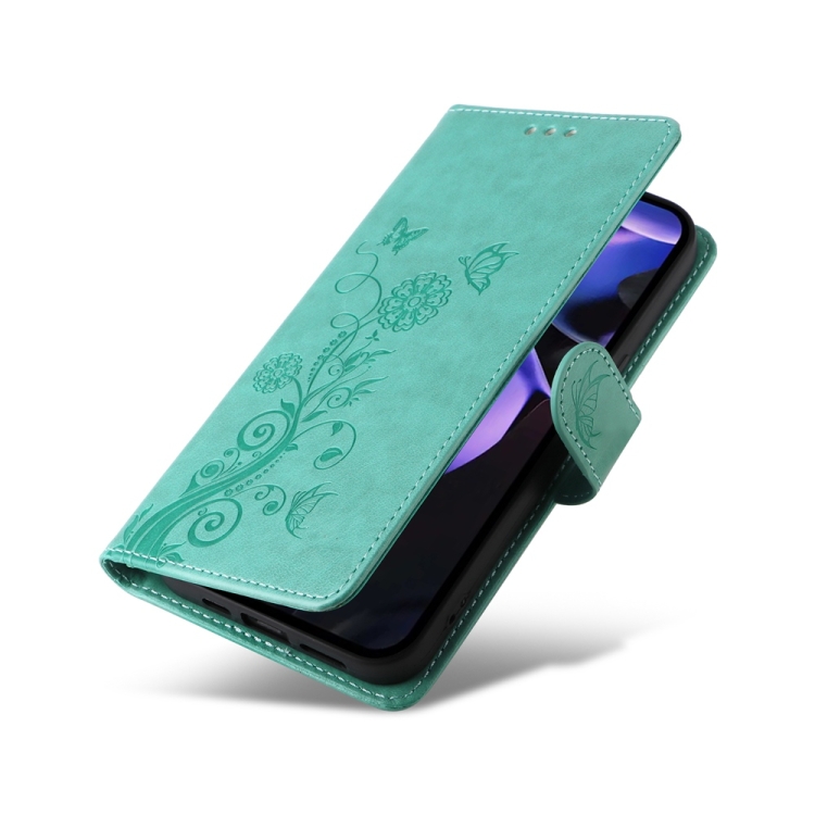 Funda de Cuero para Google Pixel 9A con Diseño de Mariposas y Flores en Relieve (Verde)