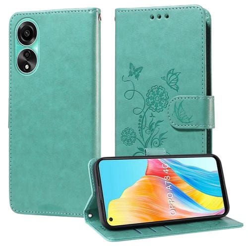 Funda de Cuero con Diseño de Mariposas y Flores En Relieve para Oppo A78 4G (Verde)