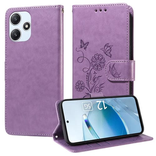Funda de Cuero con Diseño de Mariposas y Flores En Relieve para Redmi 12 5G/4G/Note 12R (Morado)