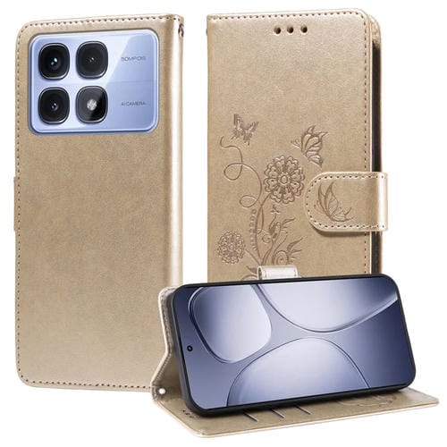 Funda de Cuero con Diseño de Mariposas y Flores En Relieve para Redmi K70 Ultra (Dorada)
