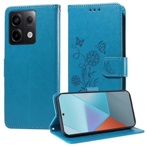 Funda de Cuero con Diseño de Mariposas y Flores En Relieve para Redmi Note 13 Pro 5G (Azul)