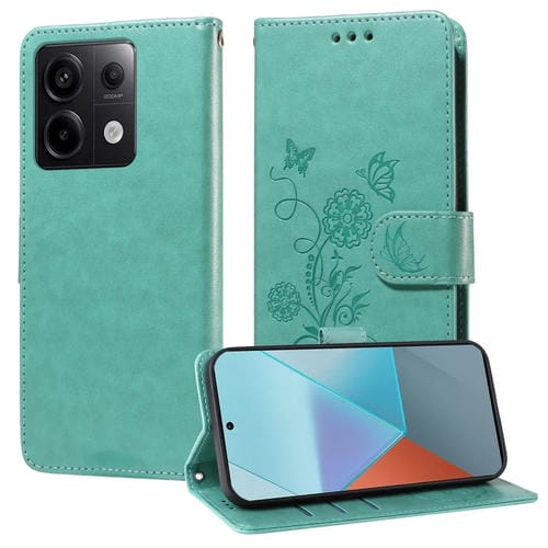 Funda de Cuero con Diseño de Mariposas y Flores En Relieve para Redmi Note 13 Pro 5G (Verde)