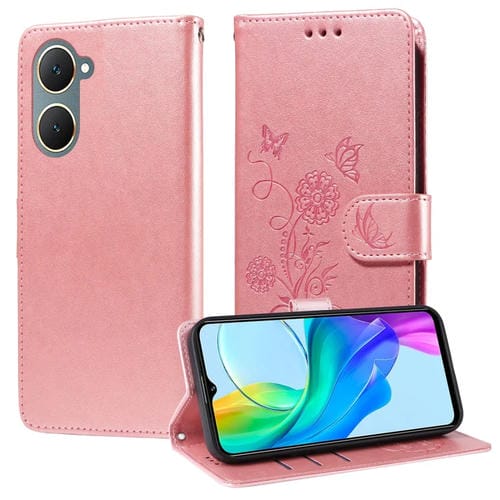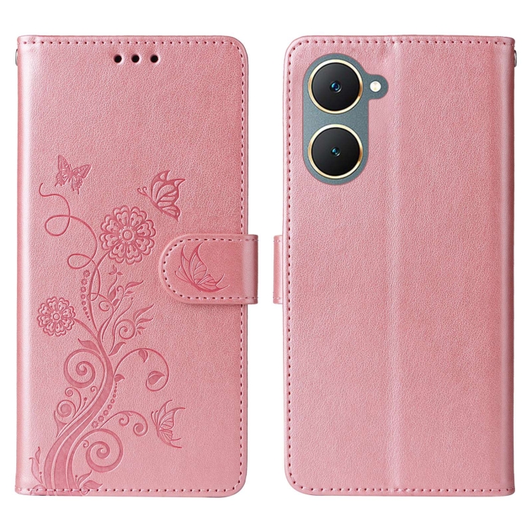 Funda de Cuero con Diseño de Mariposas y Flores En Relieve para Vivo Y03 4G / Y18 / Y28S 5G (Oro Rosa)