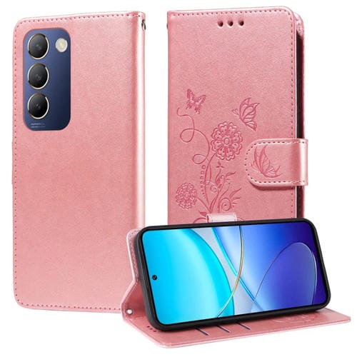 Funda de Cuero con Diseño de Mariposas y Flores En Relieve para Vivo Y100 Idn / Y200E 5G (Oro Rosa)
