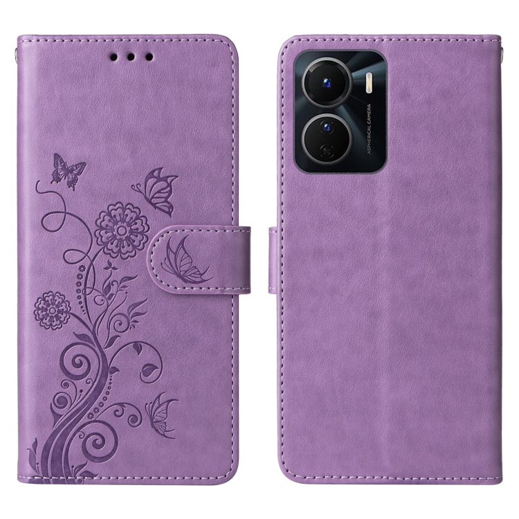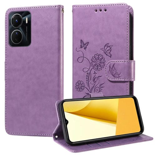 Funda de Cuero con Diseño de Mariposas y Flores En Relieve para Vivo Y16 4G / Y02S / Y56 5G (Morado)