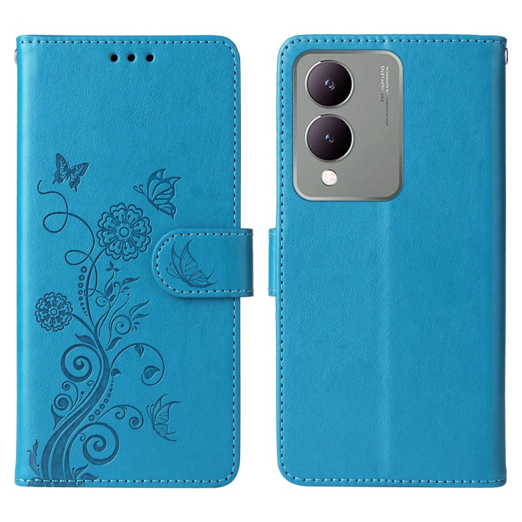 Funda de Cuero con Diseño de Mariposas y Flores En Relieve para Vivo Y17S / Y36I 5G / Y28 5G (Azul)