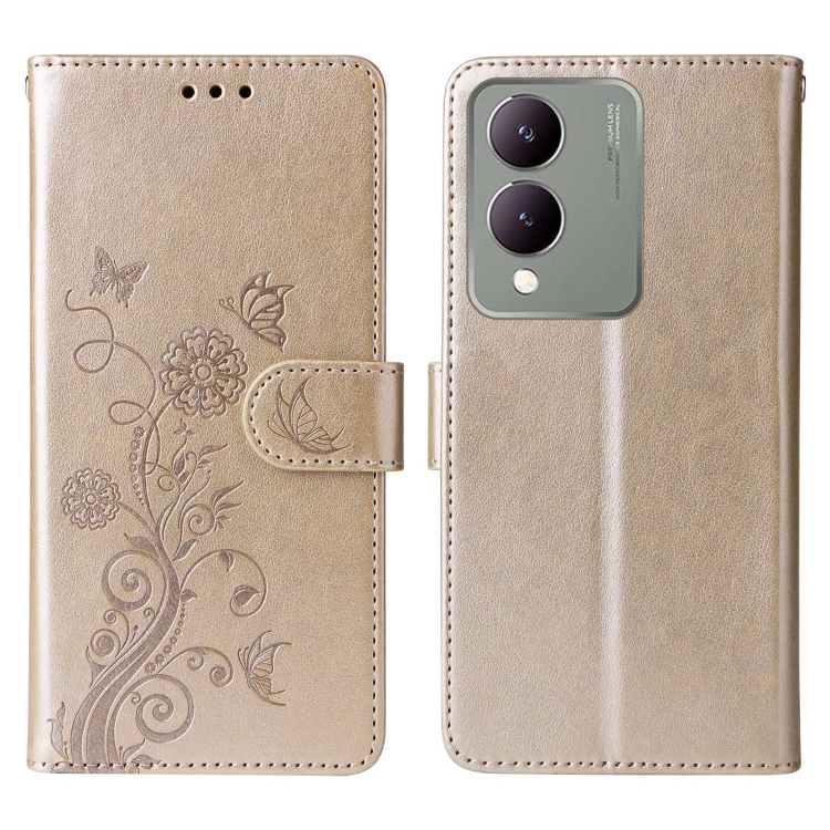 Funda de Cuero con Diseño de Mariposas y Flores En Relieve para Vivo Y17S / Y36I 5G / Y28 5G (Dorada)