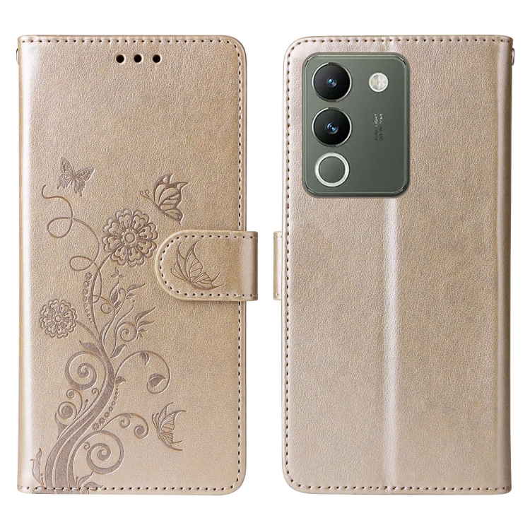 Funda de Cuero con Diseño de Mariposas y Flores En Relieve para Vivo Y200/V29E (Dorada)