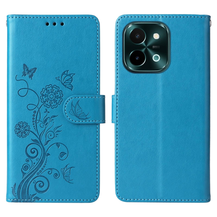 Funda de Cuero con Diseño de Mariposas y Flores En Relieve para Vivo Y28 4G (Azul)
