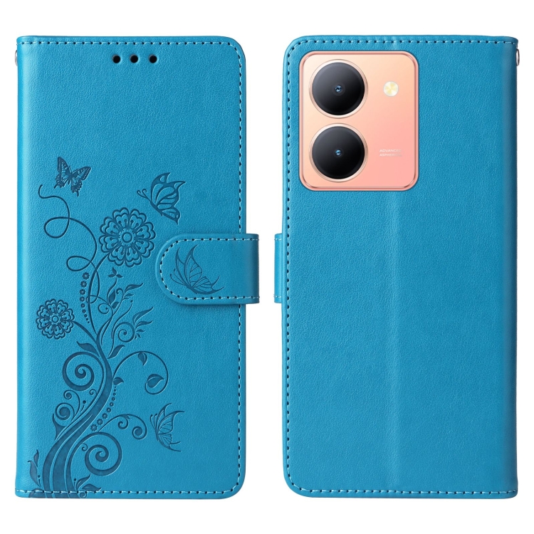 Funda de Cuero con Diseño de Mariposas y Flores En Relieve para Vivo Y36 4G/5G (Azul)