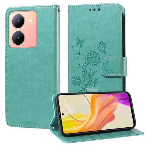 Funda de Cuero con Diseño de Mariposas y Flores En Relieve para Vivo Y36 4G/5G (Verde)