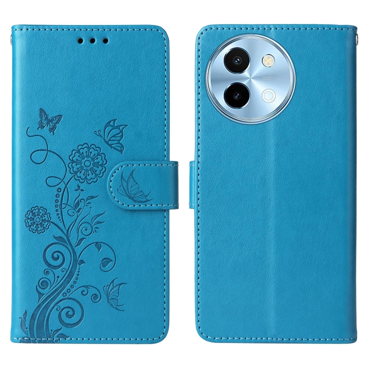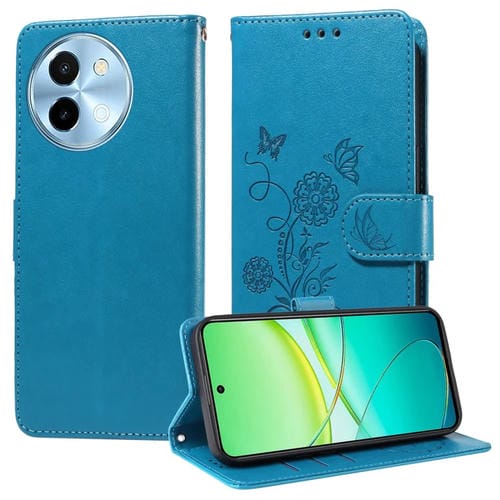 Funda de Cuero con Diseño de Mariposas y Flores En Relieve para Vivo Y38 5G / T3X 5G (Azul)