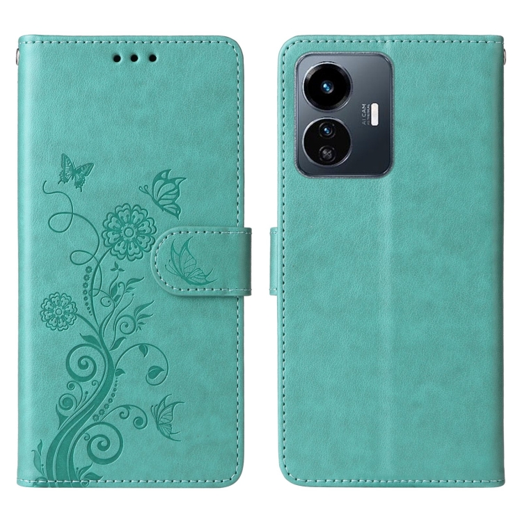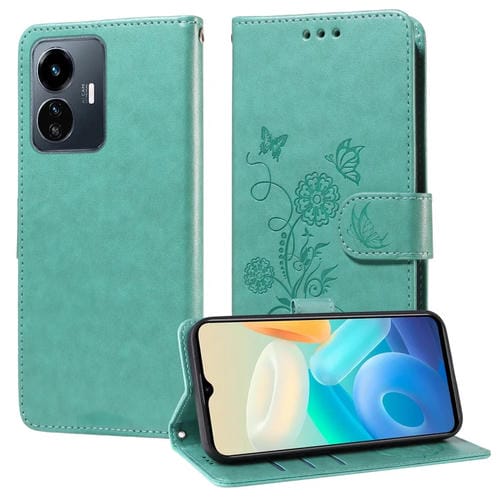 Funda de Cuero con Diseño de Mariposas y Flores En Relieve para Vivo Y77 5G (Verde)