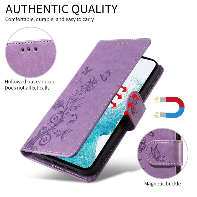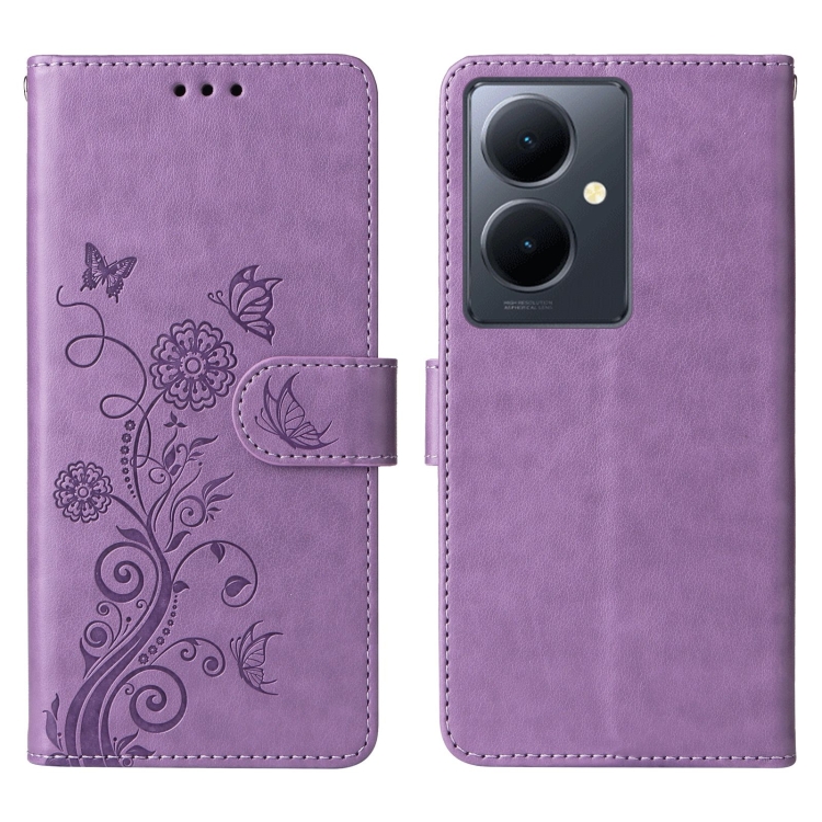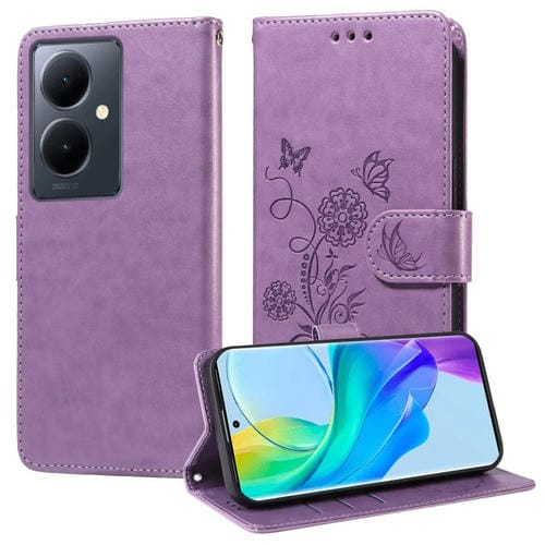 Funda de Cuero con Diseño de Mariposas y Flores En Relieve para Vivo Y78 5G (Morado)