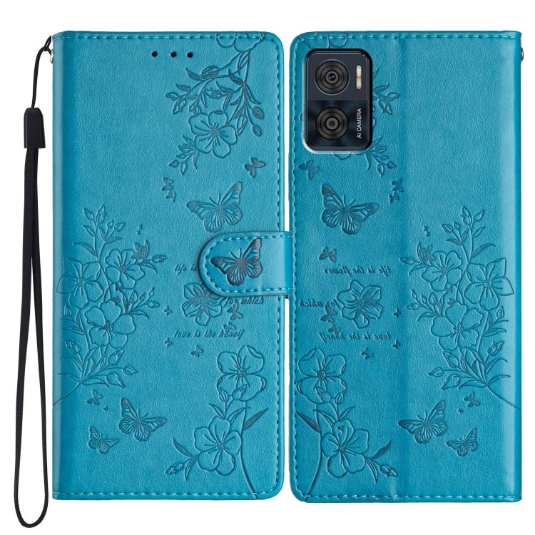 Funda de Cuero Motorola Moto E22 con Diseño de Mariposas y Flores (Azul)