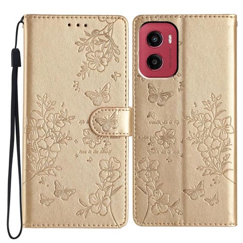 Funda de Cuero Motorola Moto G05 con Diseño de Mariposas y Flores (Dorada)