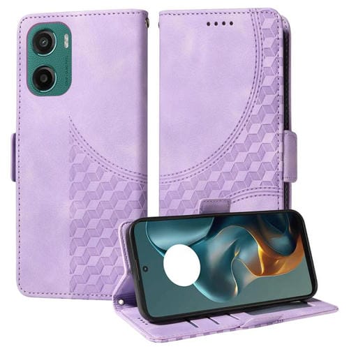 Funda de Cuero Motorola Moto G05/E15 con Diseño de Rombos y Estrellas en Relieve (Morado)