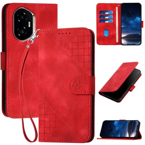 Funda de Cuero para Honor 300 con Diseño En Relieve de Mariposa y Cuadrícula y Cordón (Rojo)