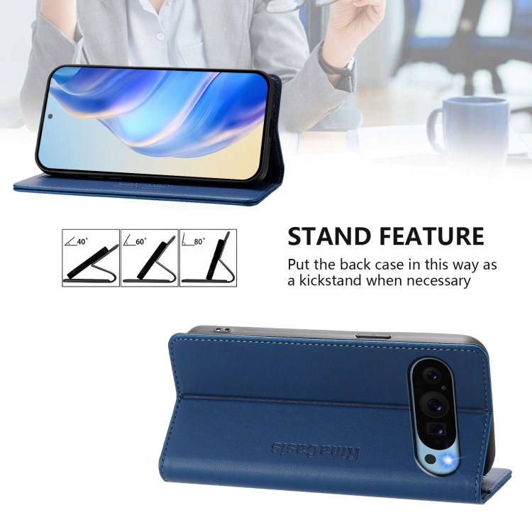 Funda de Cuero con Doble Pliegue y Succión Magnética RFID para Google Pixel 9 Pro XL Rc01 (Azul Oscuro)