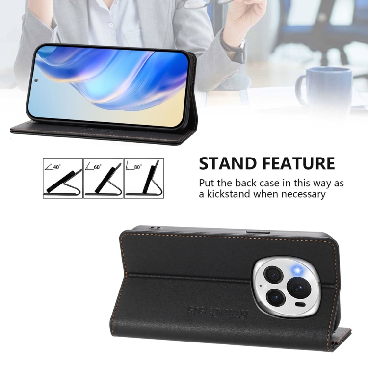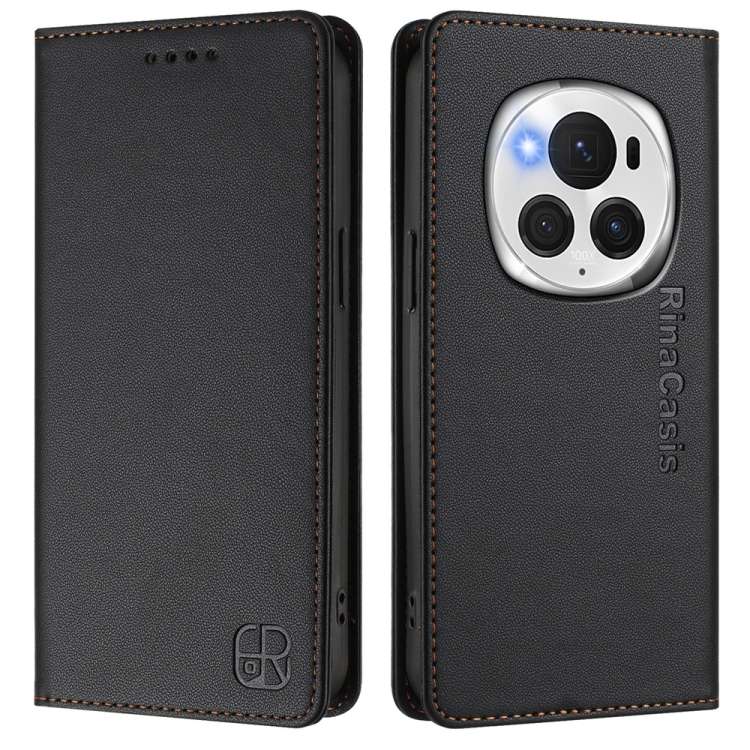 Funda de Cuero Rfid para Honor Magic6 Pro Global Rc01 con Doble Pliegue y Succión Magnética (Negra)