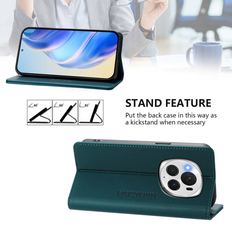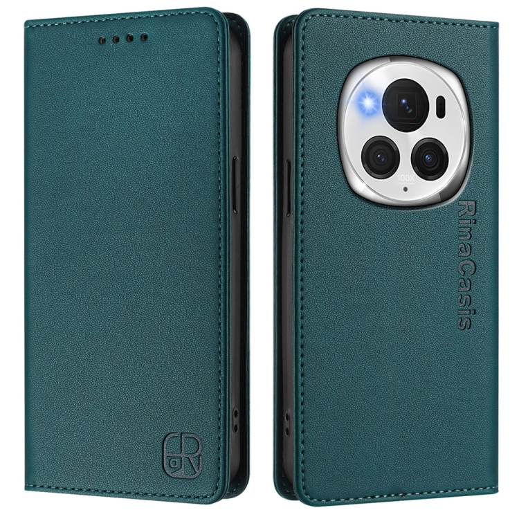 Funda de Cuero Rfid con Doble Pliegue y Succión Magnética para Honor Magic6 Pro Global Rc01 (Verde Oscuro)