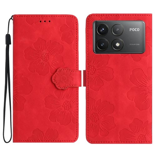 Funda de Cuero con Estampado de Flores En Relieve para Xiaomi Poco F6 Pro (Rojo)