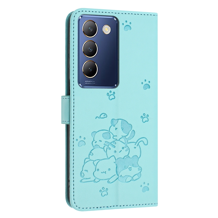 Funda de Piel con Estampado de Gatito y Cordón para Vivo Y100 Idn / Y200E 5G (Verde Menta)