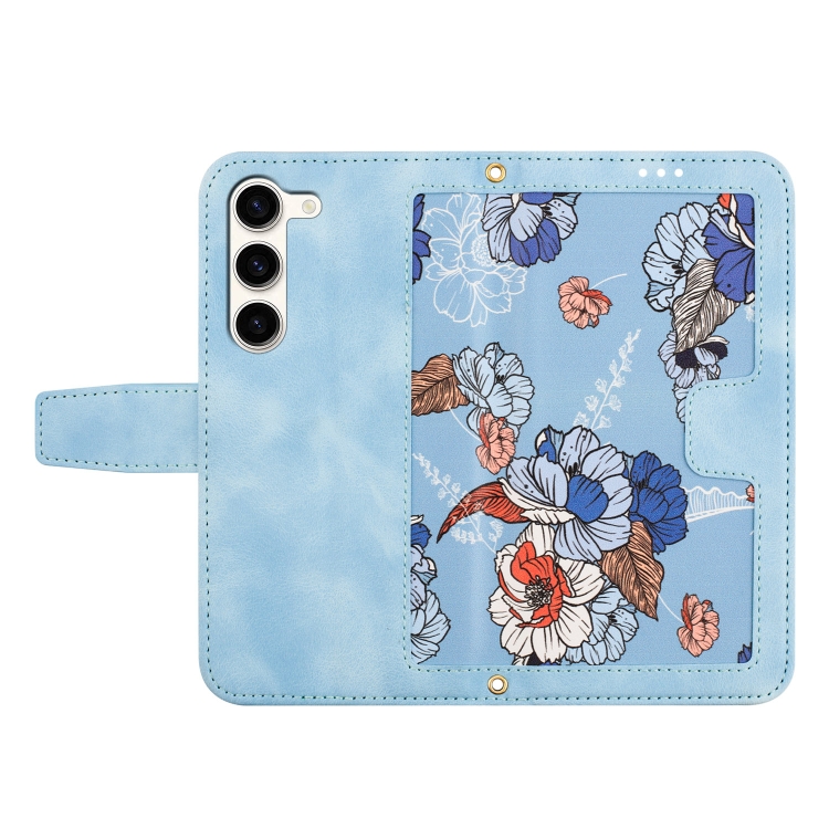 Funda Cuero Samsung Galaxy S23+ 5G Estampado Floral Cordón (Azul Claro)